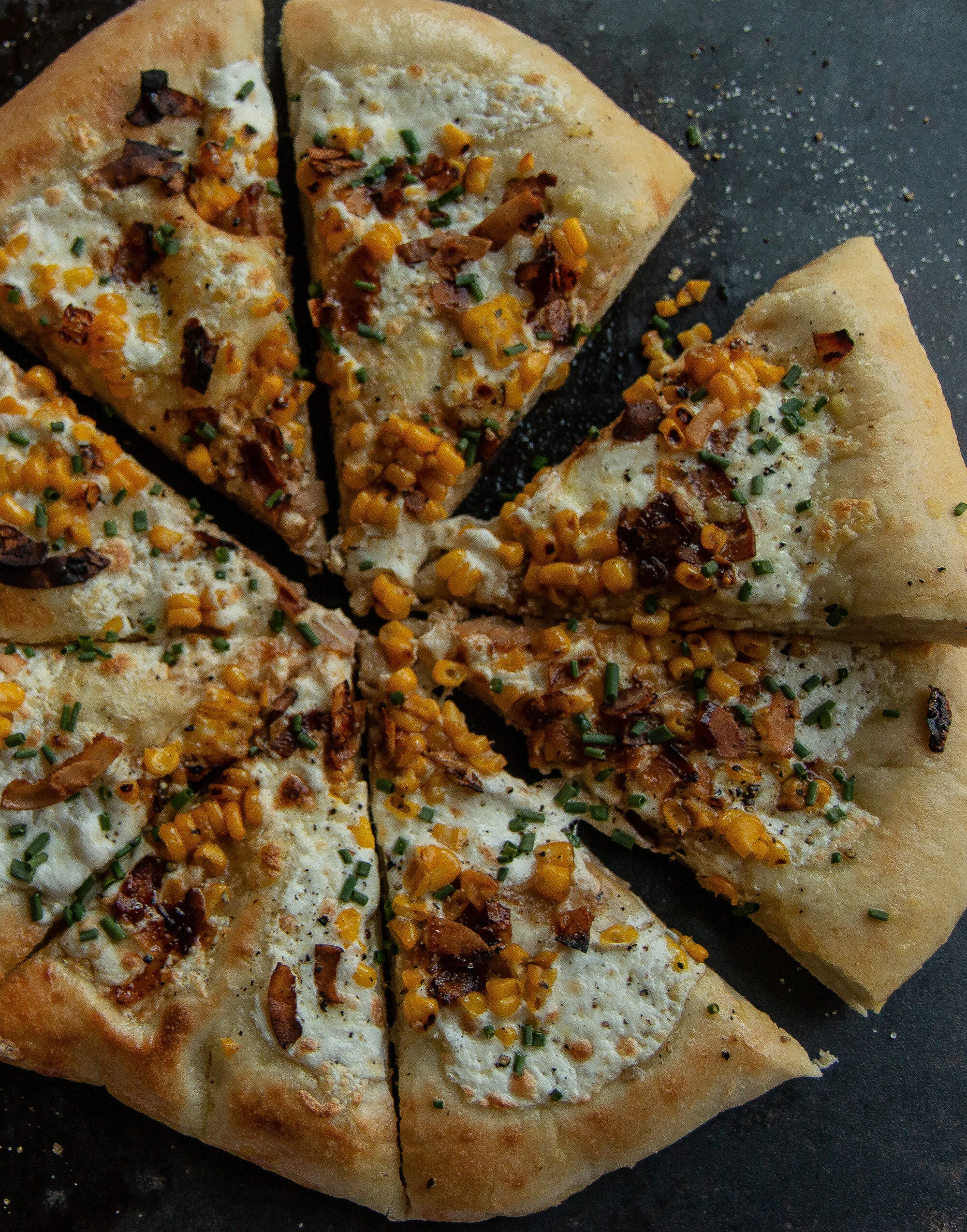 Our house, from time to time, has been known to make a lot of pizza. We are big fans. A few years ago, I bought The Pizza Bible for my hubs, for he was in want of the perfect pizza crust. This book 100% delivered. However, the perfect crust takes 3 days to make, which doesn’t always allow for spontaneity. So, I researched and developed a crust that is ready in a little over an hour and paired it with some all-star toppings—burrata, grilled corn and coconut bacon. If you haven’t tried coconut bacon yet, let me tell you it is worth the hype and so easy to make. Garnish with chives and garlic oil and the result is extremely tasty.